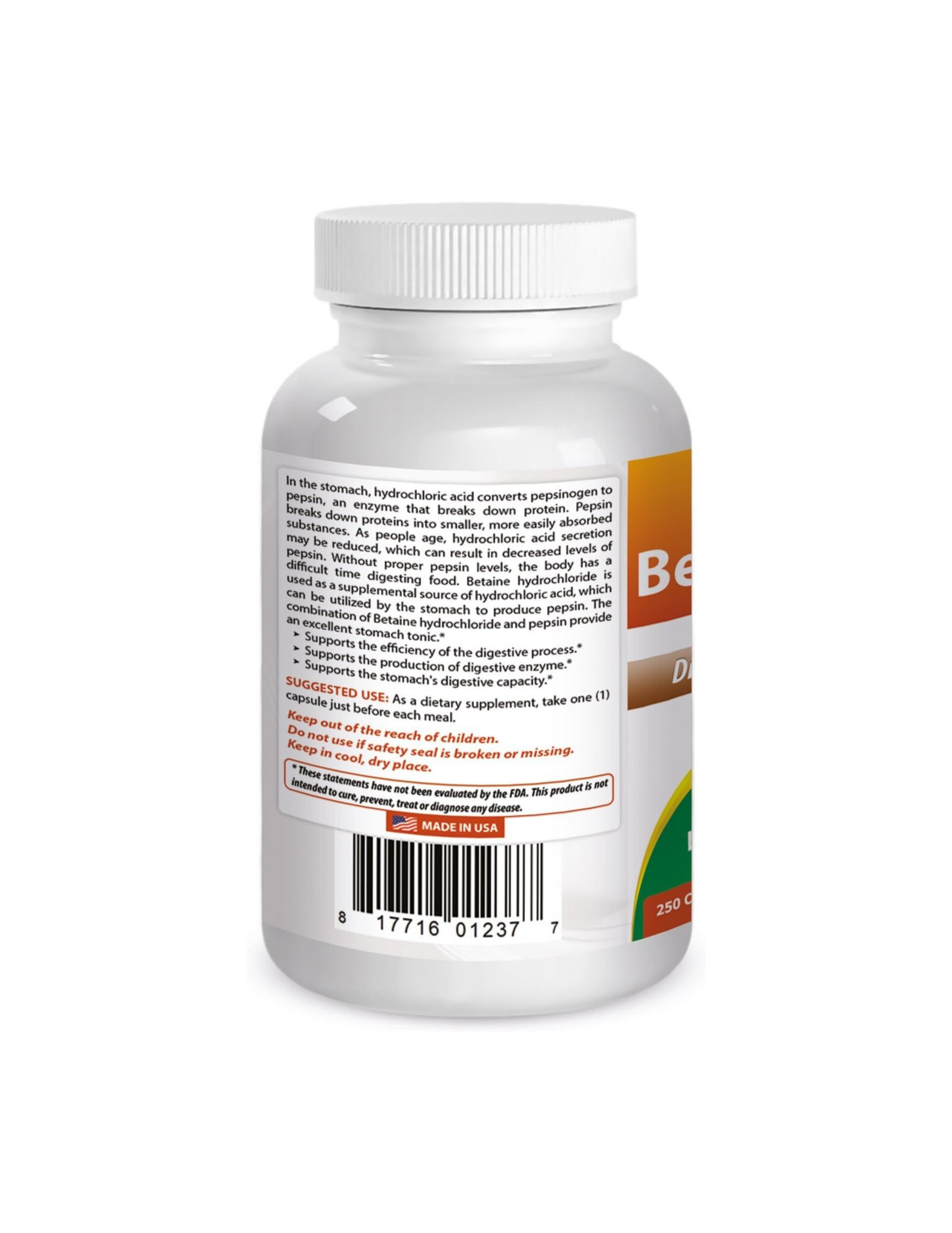 En el estómago, el ácido clorhídrico convierte el pepsinógeno en pepsina, una enzima que descompone las proteínas. La pepsina descompone las proteínas en sustancias más pequeñas y de más fácil absorción. A medida que las personas envejecen, la secreción de ácido clorhídrico puede reducirse, lo que puede provocar una disminución de los niveles de pepsina. Sin niveles adecuados de pepsina, el cuerpo tiene dificultades para digerir los alimentos. El clorhidrato de betaína se utiliza como fuente suplementaria de ácido clorhídrico, que el estómago puede utilizar para producir pepsina. La combinación de clorhidrato de betaína y pepsina proporciona un excelente tónico estomacal.