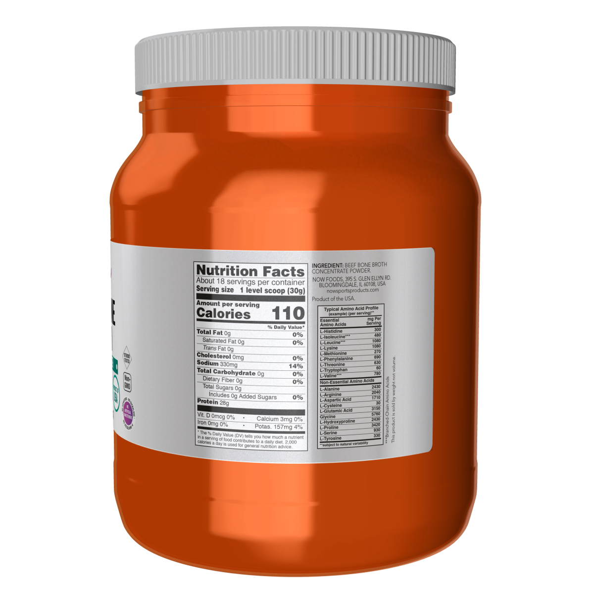 - El caldo de huesos de res en polvo de NOW® Sports es un extracto de hueso de res de primera calidad que tiene 28 g de proteína por porción. El caldo de huesos de res es una base alimenticia común en muchas culturas y tiene proteínas, aminoácidos, colágeno y más de origen natural.