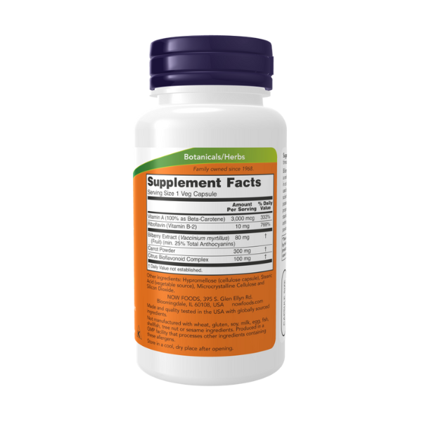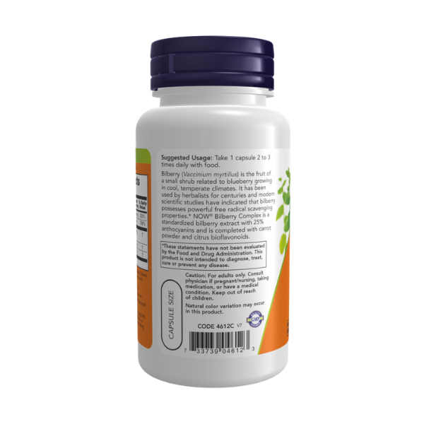 El arándano ( Vaccinium myrtillus ) es el fruto de un pequeño arbusto emparentado con el arándano azul, que crece en climas fríos y templados. Ha sido utilizado por herbolarios durante siglos y estudios científicos modernos han indicado que posee potentes propiedades neutralizadoras de radicales libres.* NOW® Bilberry Complex es un extracto estandarizado de arándano con un 25 % de antocianinas, complementado con polvo de zanahoria y bioflavonoides cítricos.