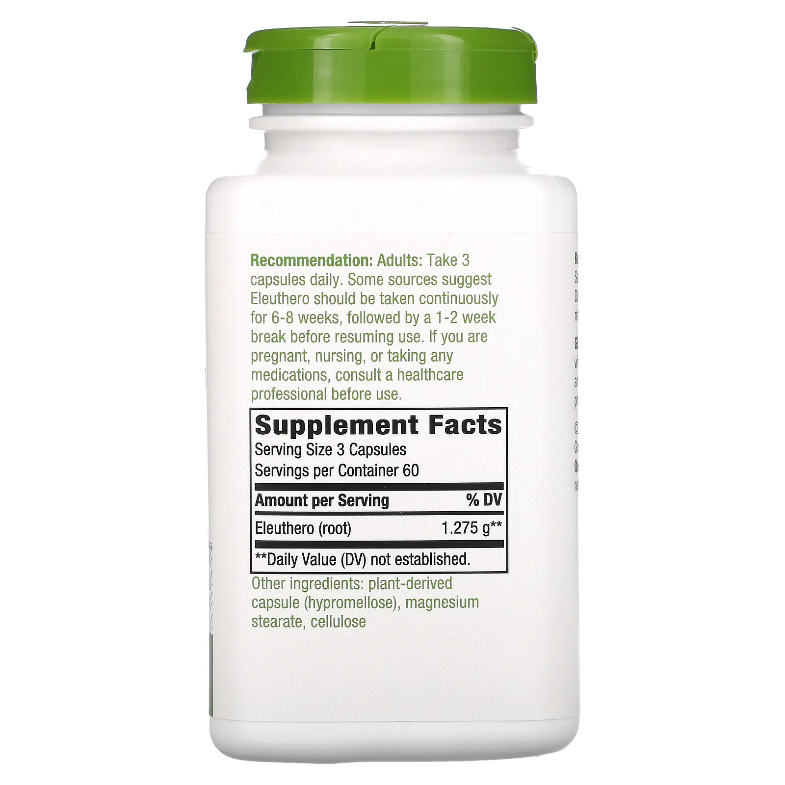 Tomar 3 cápsulas al día. Algunas fuentes sugieren que Eleuthero debe tomarse de forma continua durante 6 a 8 semanas, seguido de un descanso de 1 a 2 semanas antes de reanudar su uso.