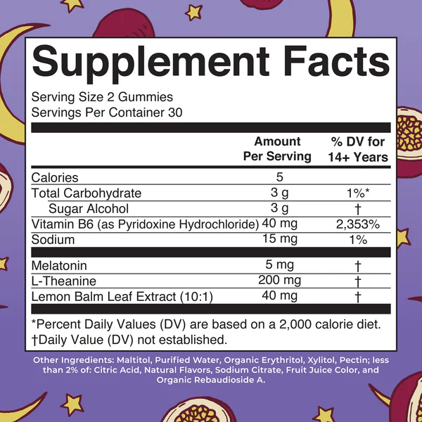 ¡Promueva la relajación y relájese para una noche de sueño reparador con estas deliciosas gomitas veganas! Completo con una mezcla de bálsamo de limón, L-teanina, vitamina B6 y melatonina añadida para ayudarlo a conciliar el sueño, ¡todo en un delicioso sabor a maracuyá y té de jazmín!