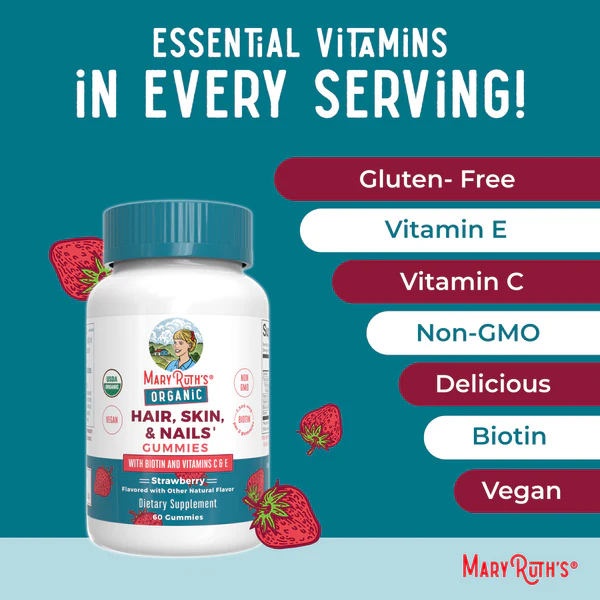 - ¡Estas deliciosas gomitas veganas con sabor a fresa fueron formuladas para apoyar la salud de tu cabello, piel y uñas! Con tres vitaminas importantes en una gominola: vitaminas C, E y biotina.