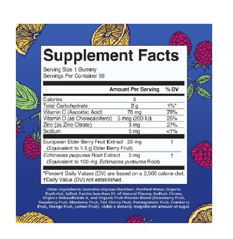 - Esta fórmula incluye baya del saúco, zinc, equinácea, vitamina D y vitamina C.