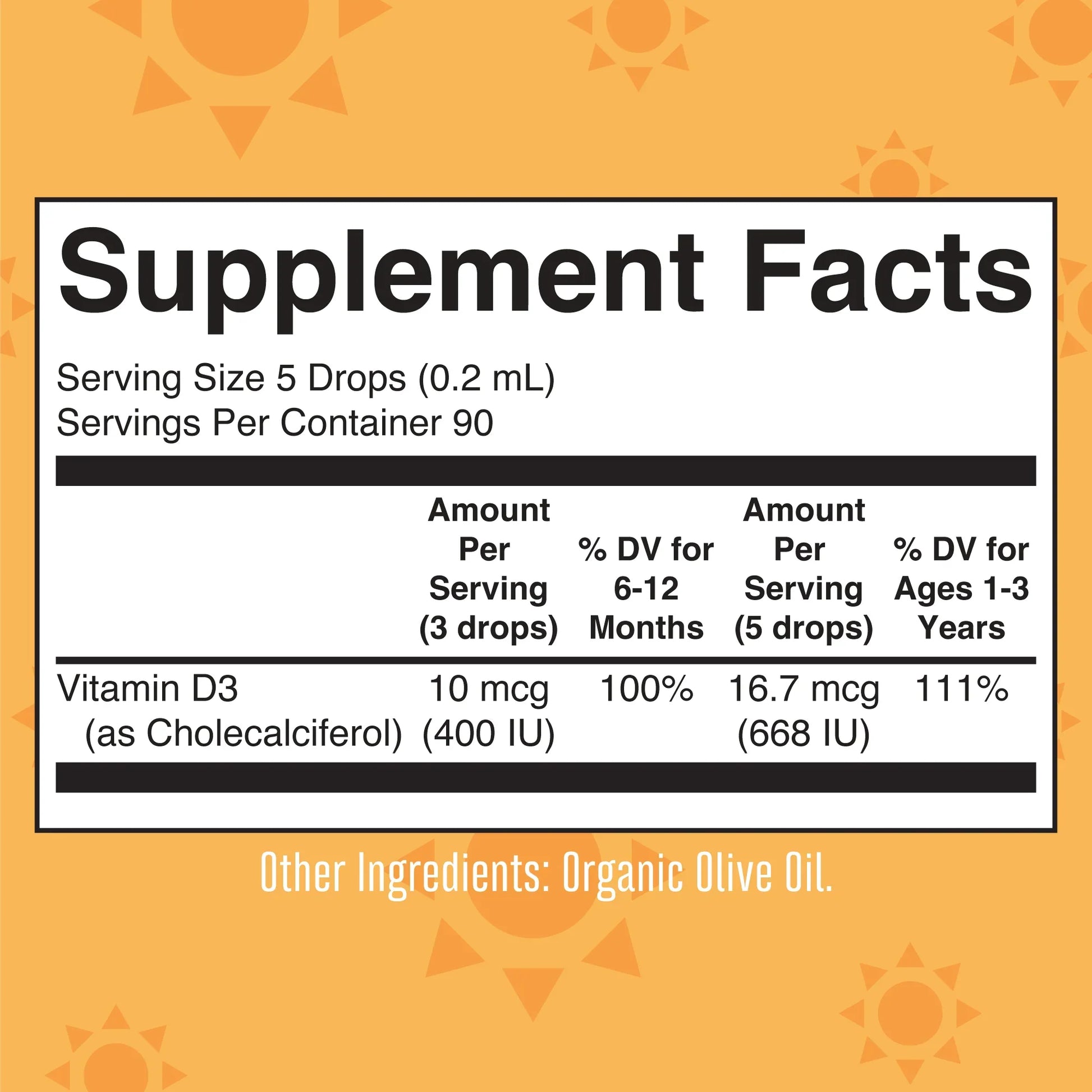 Apoye la inmunidad, la salud ósea y más con las gotas orgánicas de vitamina D3 para bebés y niños pequeños. D3, o colecalciferol, es el mismo tipo de vitamina D que el cuerpo de su hijo produce naturalmente cuando se expone a la luz solar, ¡aquí en forma de gota vegana y fácil de tomar!