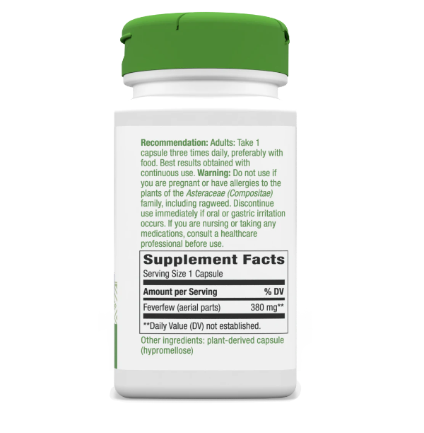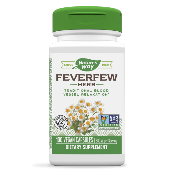 - Nature's Way Feverfew se utiliza tradicionalmente para favorecer la relajación de los vasos sanguíneos.*