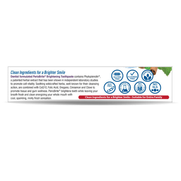 La pasta de dientes a base de hierbas PerioBrite ilumina los dientes y deja el aliento fresco y limpio, energizando toda la boca con una sensación fresca, chispeante y mentolada.