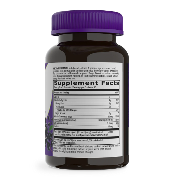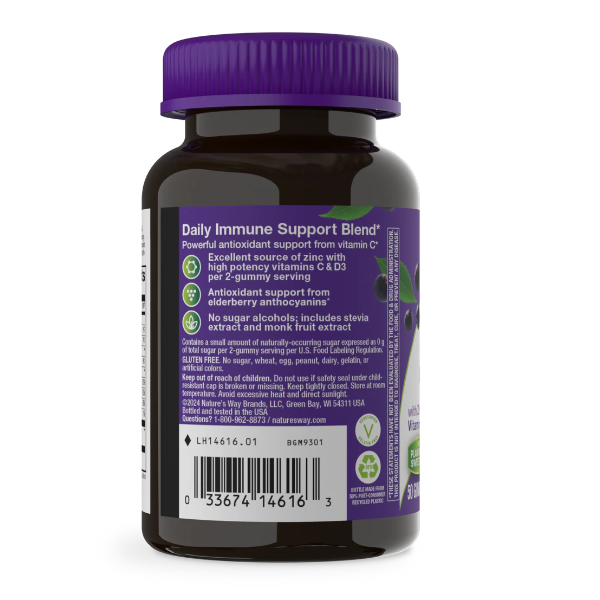 - Las gomitas inmunitarias sin azúcar Sambucus con extracto de saúco negro combinan zinc, el 100 % del valor diario recomendado de vitamina C y el 150 % del valor diario recomendado de vitamina D3 para apoyar su sistema inmunológico durante todo el año.*
